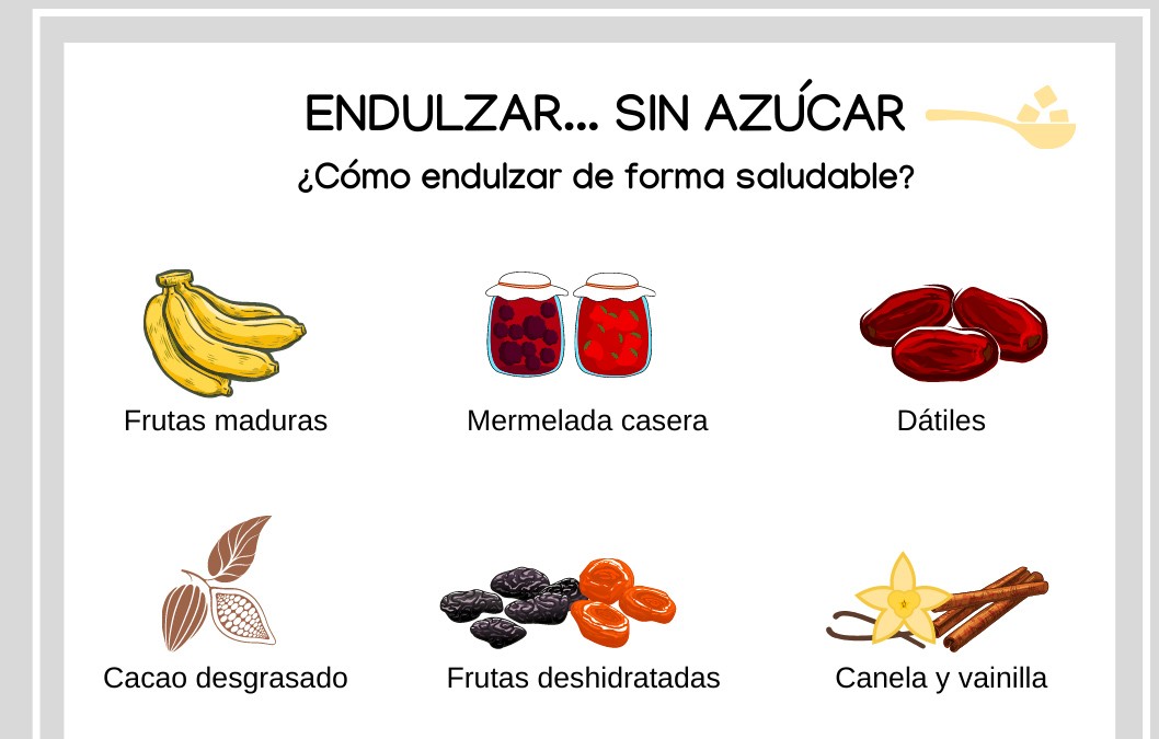 Endulzar de manera natural se puede llevar a cabo con canela, coco rallado, frutas maduras. Si hablamos de repostería podemos utilizar plátano, dátiles, frutas desecadas o incluso mermeladas caseras.